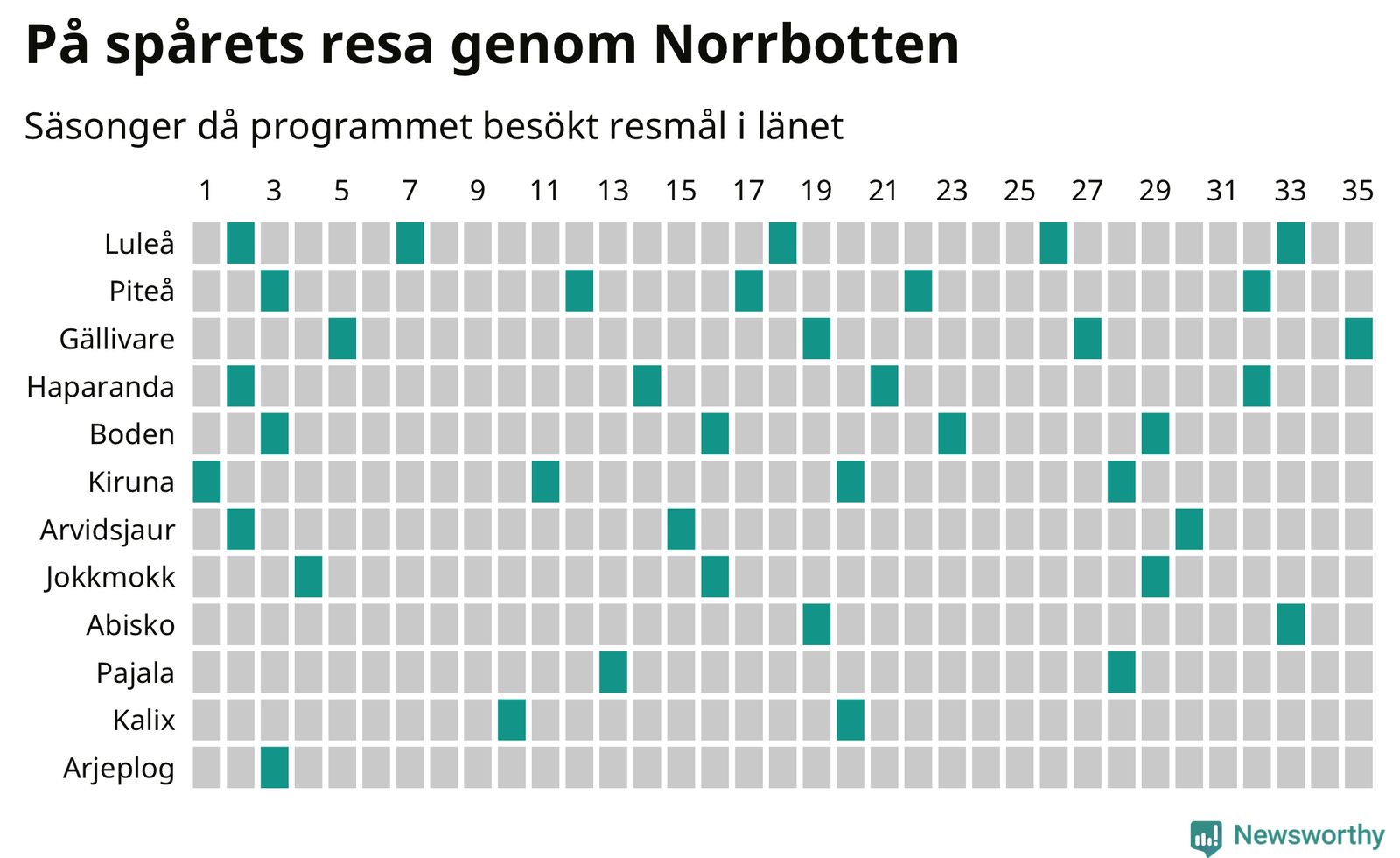 I flera år har Newsworthy samlat ett stort antal datapunkter om alla dessa tätorter för att försöka knäcka På spåret-koden. Och några saker står klart: Att det finns en järnvägsstation på orten har viss betydelse, men är inte nödvändigt. Av de 163 svenska orter som hittills fått vara med i programmet finns det perronger i 129. Av de 34 resmål utan järnvägsstation har Visby besökts oftast, sex gånger. Men det finns ytterligare ungefär 350 svenska orter med tågstation där På spåret aldrig varit.
