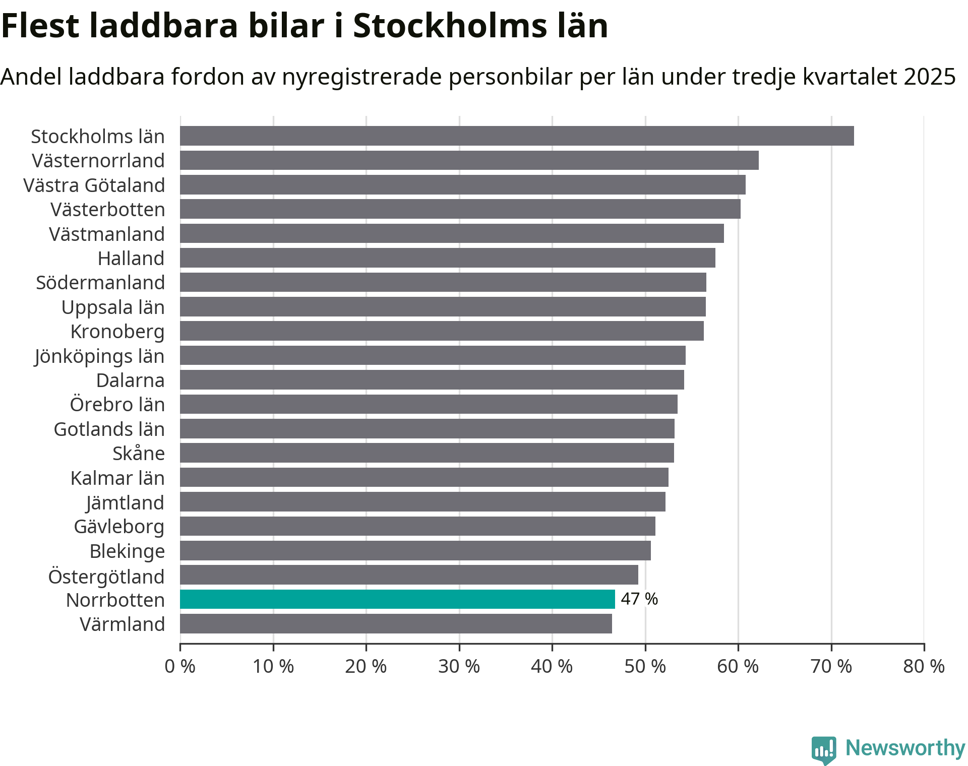 I hela landet var 62 procent av alla nya bilar laddbara under tredje kvartalet. Det är något färre än föregående kvartal (−0,5 procentenheter). I Norrbottens län var 47 procent av de nya bilarna laddbara, vilket är färre än föregående kvartal (−7,4 procentenheter).