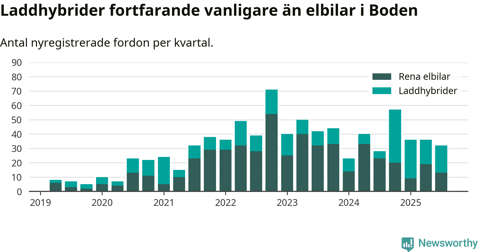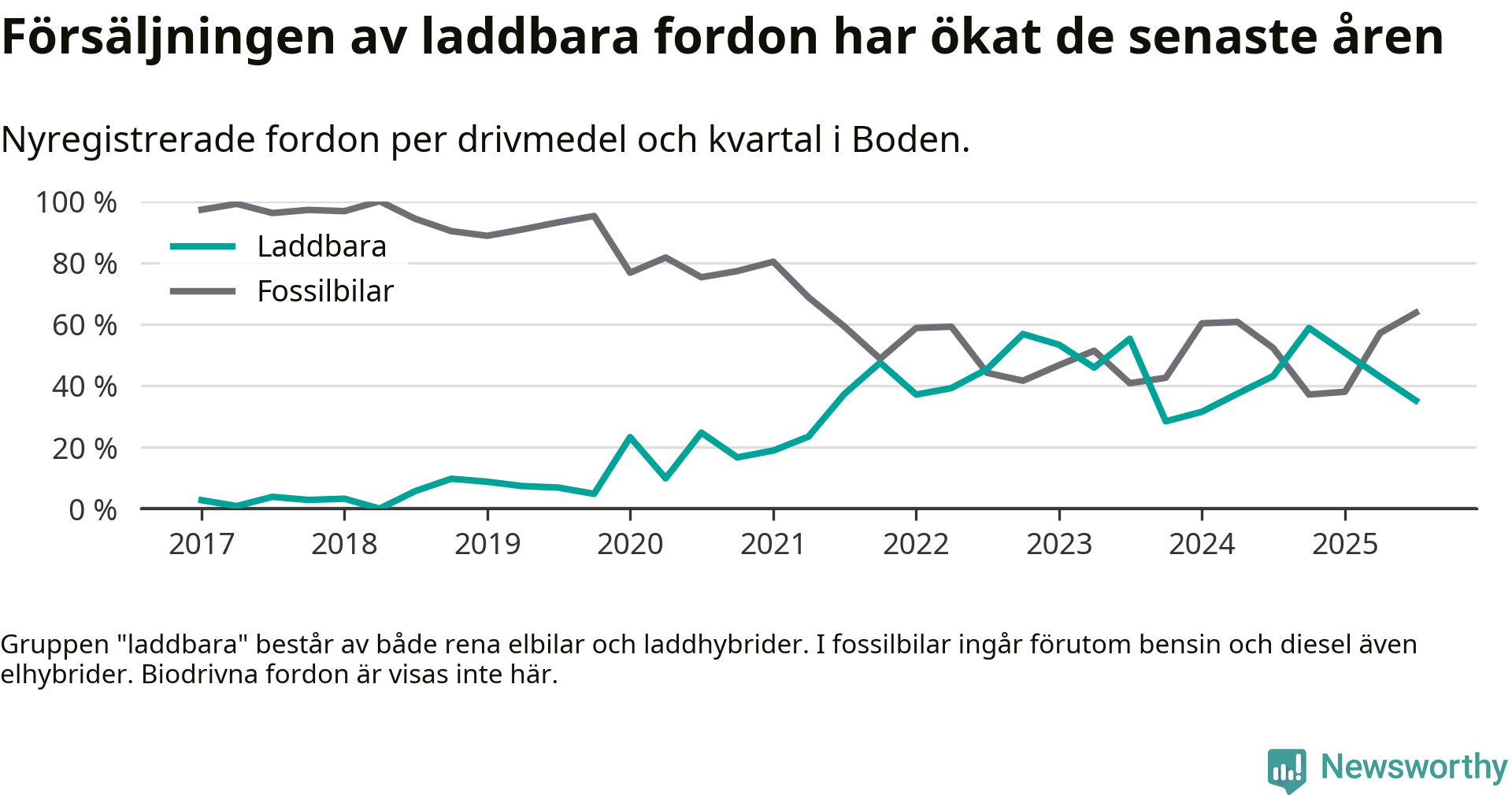 Under tredje kvartalet 2025 var 35 procent av alla nyregistrerade personbilar i Boden laddbara (sammanlagt registrerades 91 nya bilar). Merparten av de laddbara bilarna var så kallade laddhybrider, det vill säga fordon som går att ladda och köra på el, men som även har en förbränningsmotor.