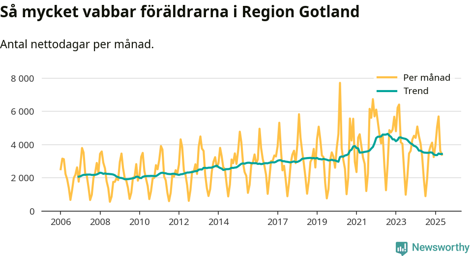När coronapandemin drog in i mars 2020 peakade antalet vabbdagar både i Region Gotland och i riket som helhet. Under de senaste två åren har vabbuttaget börjat minska igen.