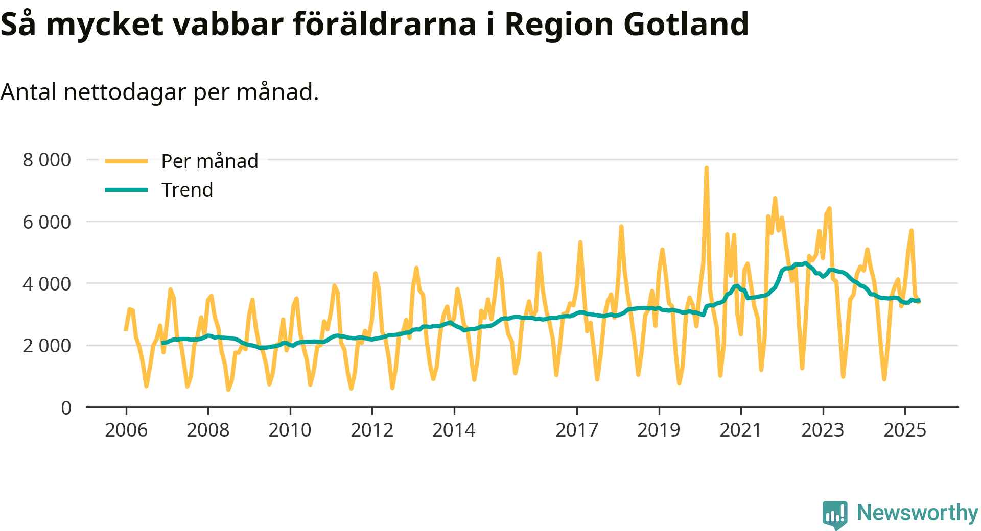 När coronapandemin drog in i mars 2020 peakade antalet vabbdagar både i Region Gotland och i riket som helhet. Under de senaste två åren har vabbuttaget börjat minska igen.